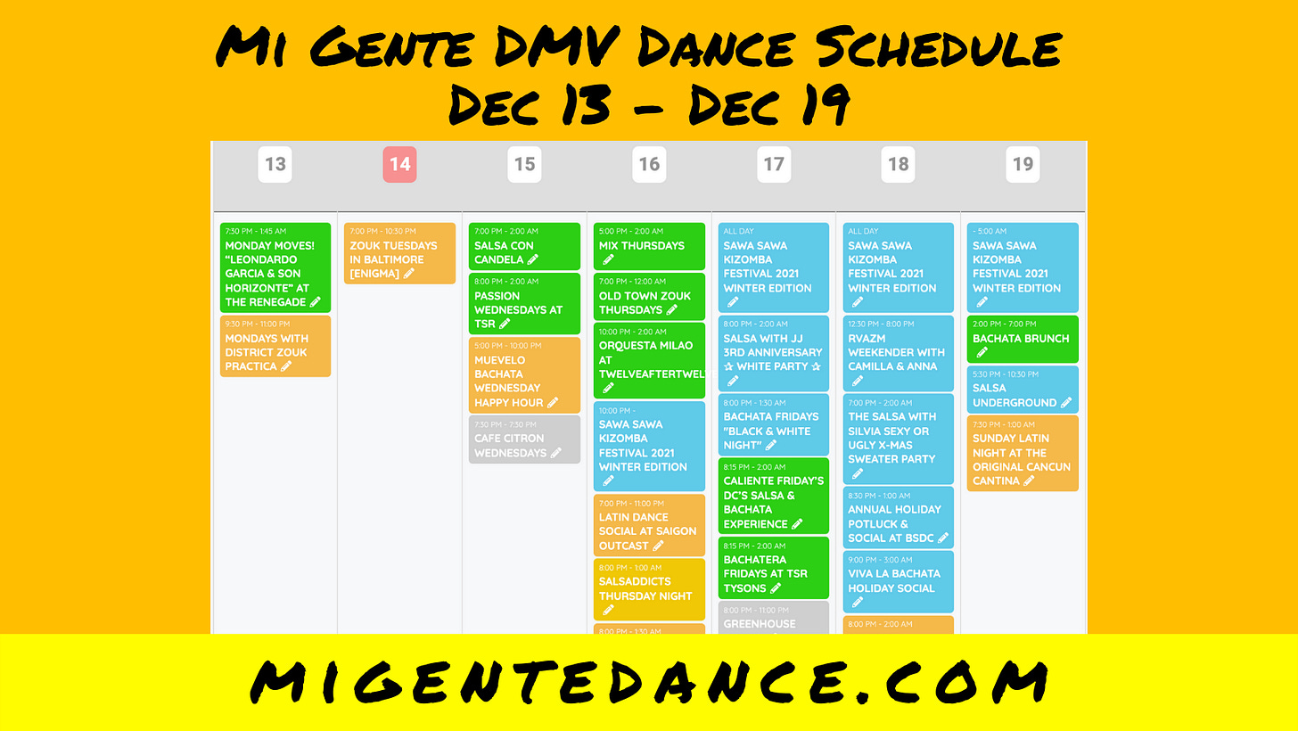 > Viva la Bachata Holiday Social, Falls Church, $15, 9-10 class, 10-3 social https://migentedance.com/events/viva-holiday/?em (Special, great)