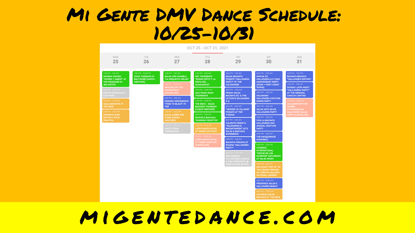 > Caliente Friday “Salsaween & Bachataween” at 618 Whiskey, DC, $10-15, 8-9 bachata class, 9-10 salsa on2 class, 10-2 social https://migentedance.com/events/caliente-fridays/?em (special, great)